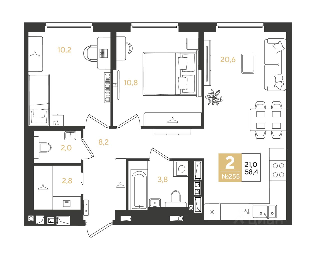Продаётся 2-комнатная квартира в строящемся доме (Литер 2), срок сдачи: II-кв. 2028, общей площадью 58.4 кв.м., на 6 этаже. Новый жилой комплекс "Самолёт-7" от застройщика "DOGMA" расположен по адресу Краснодарский край, Город Краснодар.