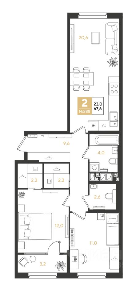 2-комн. квартира, 67,6 м²