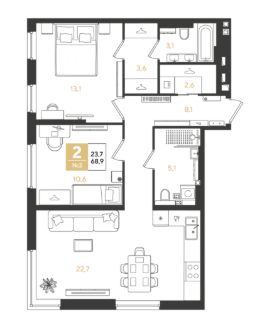 2-комн. квартира, 68,9 м²