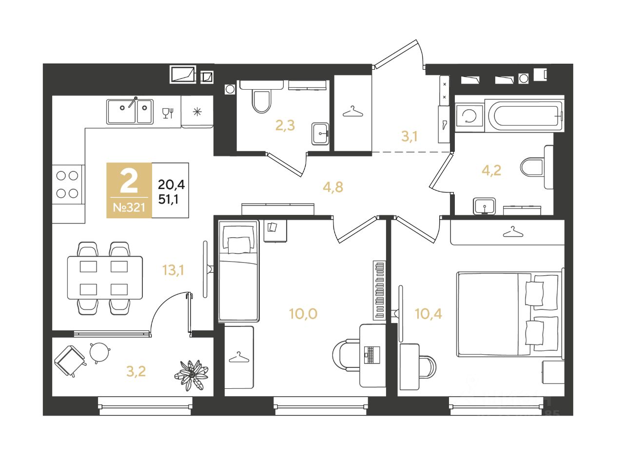 2-комн. квартира, 51,1 м²