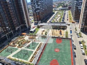 Во дворах : игровые площадки из эко-материалов, спортивное поле( баскетбол, футбол, волейбол), станции для зарядки телефонов и WI-FI.