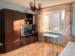 Напольное покрытие в жилой комнате - паркет; в прихожей и кухне - ламинат; на балконе и в санузле - плитка. Потолочное покрытие в квартире - побелка, покрытая качественной водоэмульсионной краской.