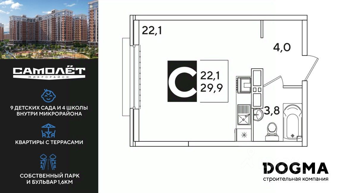 DOGMA - ТОП-3 застройщик по объему строительства в РФ. "САМОЛЁТ" — концептуальный жилой микрорайон, который расположен на северо-западе Краснодара, в районе Западного Обхода. Квартал спроектирован как "город в городе", поэтому здесь будет всё для комфортной жизни: современные дома с разными планировками, дороги, школы и детские сады, поликлиника, торговые центры, парки и аллеи. Микрорайон находится далеко от промышленных предприятий, сочетает удобство городской жизни и экологически благоприятную среду. Инфраструктура нового микрорайона: • 4 школы и 9 детских садов на территории микрорайона • Функциональные планировки • Собственный бульвар протяжённостью 1,6км • Светомузыкальный фонтан протяжённостью 55 метров • Амфитеатр • Парк 7 ГА • Скейт-парк • Детская аква-площадка • Круглосуточное видеонаблюдение и пост охраны Приобрести квартиру можно одним из способов: ипотека, рассрочка, наличный расчет.
