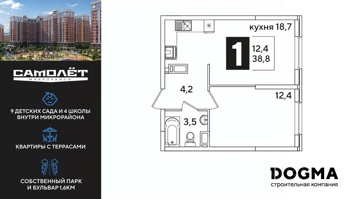 DOGMA - ТОП-3 застройщик по объему строительства в РФ. "САМОЛЁТ" — концептуальный жилой микрорайон, который расположен на северо-западе Краснодара, в районе Западного Обхода. Квартал спроектирован как "город в городе", поэтому здесь будет всё для комфортной жизни: современные дома с разными планировками, дороги, школы и детские сады, поликлиника, торговые центры, парки и аллеи. Микрорайон находится далеко от промышленных предприятий, сочетает удобство городской жизни и экологически благоприятную среду. Инфраструктура нового микрорайона: • 4 школы и 9 детских садов на территории микрорайона • Функциональные планировки • Собственный бульвар протяжённостью 1,6км • Светомузыкальный фонтан протяжённостью 55 метров • Амфитеатр • Парк 7 ГА • Скейт-парк • Детская аква-площадка • Круглосуточное видеонаблюдение и пост охраны Приобрести квартиру можно одним из способов: ипотека, рассрочка, наличный расчет.