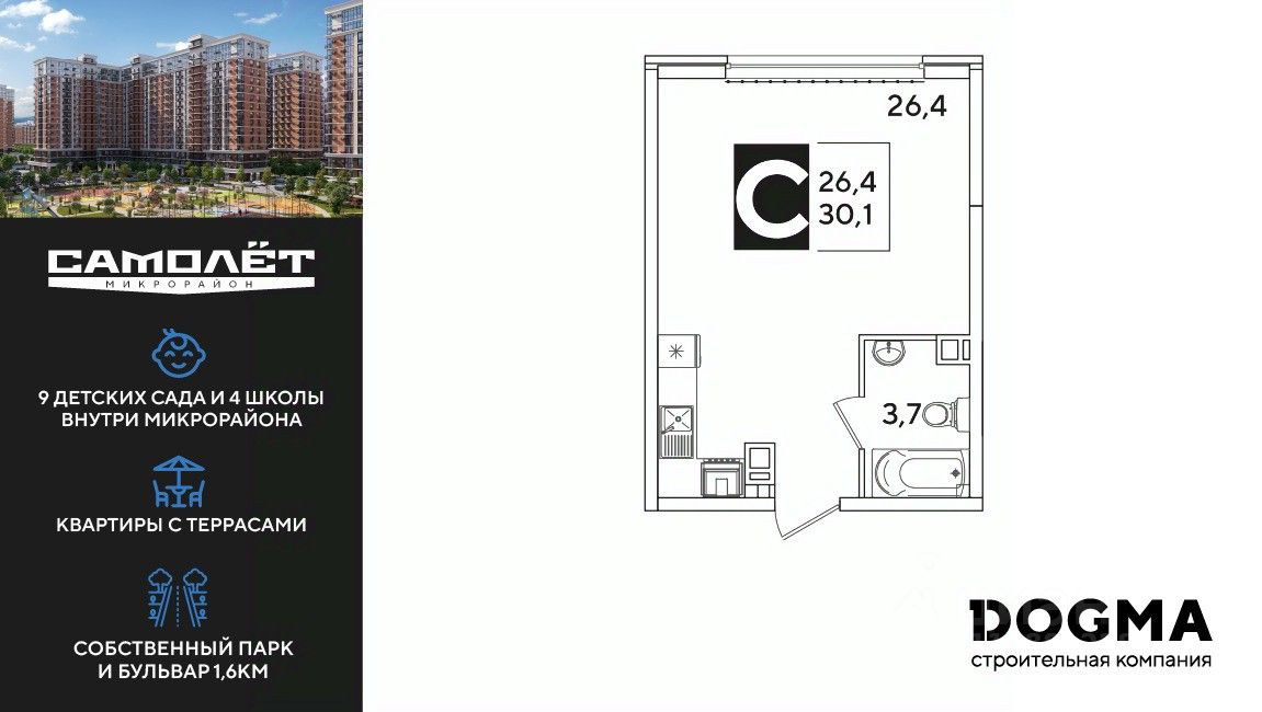 DOGMA - ТОП-3 застройщик по объему строительства в РФ. "САМОЛЁТ" — концептуальный жилой микрорайон, который расположен на северо-западе Краснодара, в районе Западного Обхода. Квартал спроектирован как "город в городе", поэтому здесь будет всё для комфортной жизни: современные дома с разными планировками, дороги, школы и детские сады, поликлиника, торговые центры, парки и аллеи. Микрорайон находится далеко от промышленных предприятий, сочетает удобство городской жизни и экологически благоприятную среду. Инфраструктура нового микрорайона: • 4 школы и 9 детских садов на территории микрорайона • Функциональные планировки • Собственный бульвар протяжённостью 1,6км • Светомузыкальный фонтан протяжённостью 55 метров • Амфитеатр • Парк 7 ГА • Скейт-парк • Детская аква-площадка • Круглосуточное видеонаблюдение и пост охраны Приобрести квартиру можно одним из способов: ипотека, рассрочка, наличный расчет.