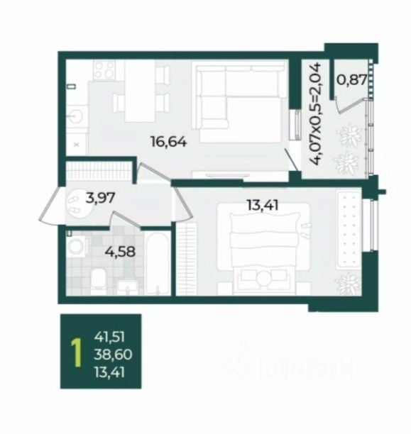 В продаже стильная 1 комнатная квартира с большой кухей -гостинной 16.64м2