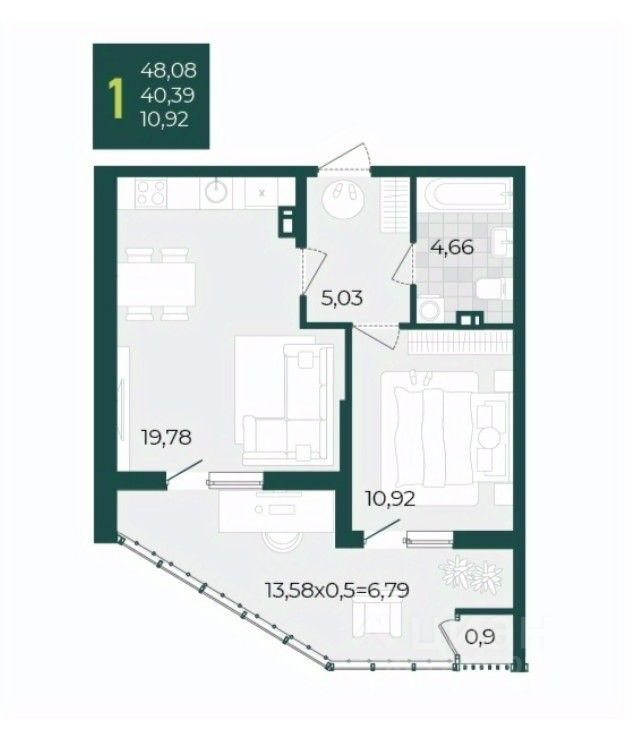 Просторная лоджия 13.58м2 станет отличным местом для отдыха, создания зимнего сада или уютного уголка для работы. Она прекрасно освещена и остеклена