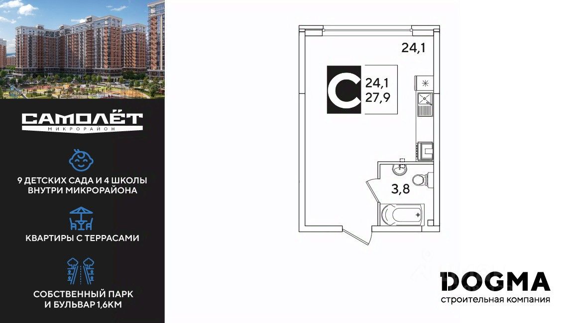 DOGMA - ТОП-3 застройщик по объему строительства в РФ. "САМОЛЁТ" — концептуальный жилой микрорайон, который расположен на северо-западе Краснодара, в районе Западного Обхода. Квартал спроектирован как "город в городе", поэтому здесь будет всё для комфортной жизни: современные дома с разными планировками, дороги, школы и детские сады, поликлиника, торговые центры, парки и аллеи. Микрорайон находится далеко от промышленных предприятий, сочетает удобство городской жизни и экологически благоприятную среду. Инфраструктура нового микрорайона: • 4 школы и 9 детских садов на территории микрорайона • Функциональные планировки • Собственный бульвар протяжённостью 1,6км • Светомузыкальный фонтан протяжённостью 55 метров • Амфитеатр • Парк 7 ГА • Скейт-парк • Детская аква-площадка • Круглосуточное видеонаблюдение и пост охраны Приобрести квартиру можно одним из способов: ипотека, рассрочка, наличный расчет.