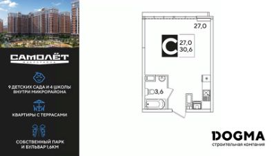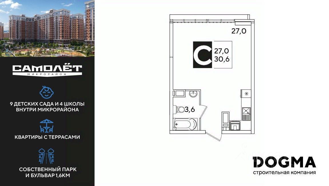 DOGMA - ТОП-3 застройщик по объему строительства в РФ. "САМОЛЁТ" — концептуальный жилой микрорайон, который расположен на северо-западе Краснодара, в районе Западного Обхода. Квартал спроектирован как "город в городе", поэтому здесь будет всё для комфортной жизни: современные дома с разными планировками, дороги, школы и детские сады, поликлиника, торговые центры, парки и аллеи. Микрорайон находится далеко от промышленных предприятий, сочетает удобство городской жизни и экологически благоприятную среду. Инфраструктура нового микрорайона: • 4 школы и 9 детских садов на территории микрорайона • Функциональные планировки • Собственный бульвар протяжённостью 1,6км • Светомузыкальный фонтан протяжённостью 55 метров • Амфитеатр • Парк 7 ГА • Скейт-парк • Детская аква-площадка • Круглосуточное видеонаблюдение и пост охраны Приобрести квартиру можно одним из способов: ипотека, рассрочка, наличный расчет.