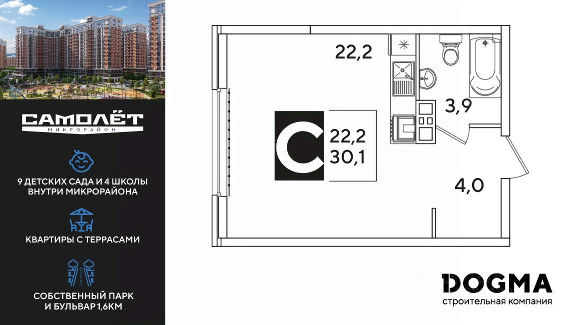 DOGMA - ТОП-3 застройщик по объему строительства в РФ. "САМОЛЁТ" — концептуальный жилой микрорайон, который расположен на северо-западе Краснодара, в районе Западного Обхода. Квартал спроектирован как "город в городе", поэтому здесь будет всё для комфортной жизни: современные дома с разными планировками, дороги, школы и детские сады, поликлиника, торговые центры, парки и аллеи. Микрорайон находится далеко от промышленных предприятий, сочетает удобство городской жизни и экологически благоприятную среду. Инфраструктура нового микрорайона: • 4 школы и 9 детских садов на территории микрорайона • Функциональные планировки • Собственный бульвар протяжённостью 1,6км • Светомузыкальный фонтан протяжённостью 55 метров • Амфитеатр • Парк 7 ГА • Скейт-парк • Детская аква-площадка • Круглосуточное видеонаблюдение и пост охраны Приобрести квартиру можно одним из способов: ипотека, рассрочка, наличный расчет.
