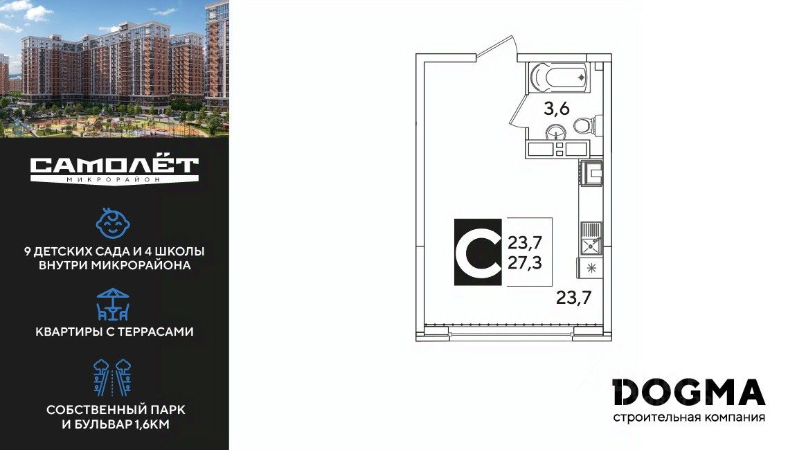DOGMA - ТОП-3 застройщик по объему строительства в РФ. "САМОЛЁТ" — концептуальный жилой микрорайон, который расположен на северо-западе Краснодара, в районе Западного Обхода. Квартал спроектирован как "город в городе", поэтому здесь будет всё для комфортной жизни: современные дома с разными планировками, дороги, школы и детские сады, поликлиника, торговые центры, парки и аллеи. Микрорайон находится далеко от промышленных предприятий, сочетает удобство городской жизни и экологически благоприятную среду. Инфраструктура нового микрорайона: • 4 школы и 9 детских садов на территории микрорайона • Функциональные планировки • Собственный бульвар протяжённостью 1,6км • Светомузыкальный фонтан протяжённостью 55 метров • Амфитеатр • Парк 7 ГА • Скейт-парк • Детская аква-площадка • Круглосуточное видеонаблюдение и пост охраны Приобрести квартиру можно одним из способов: ипотека, рассрочка, наличный расчет.