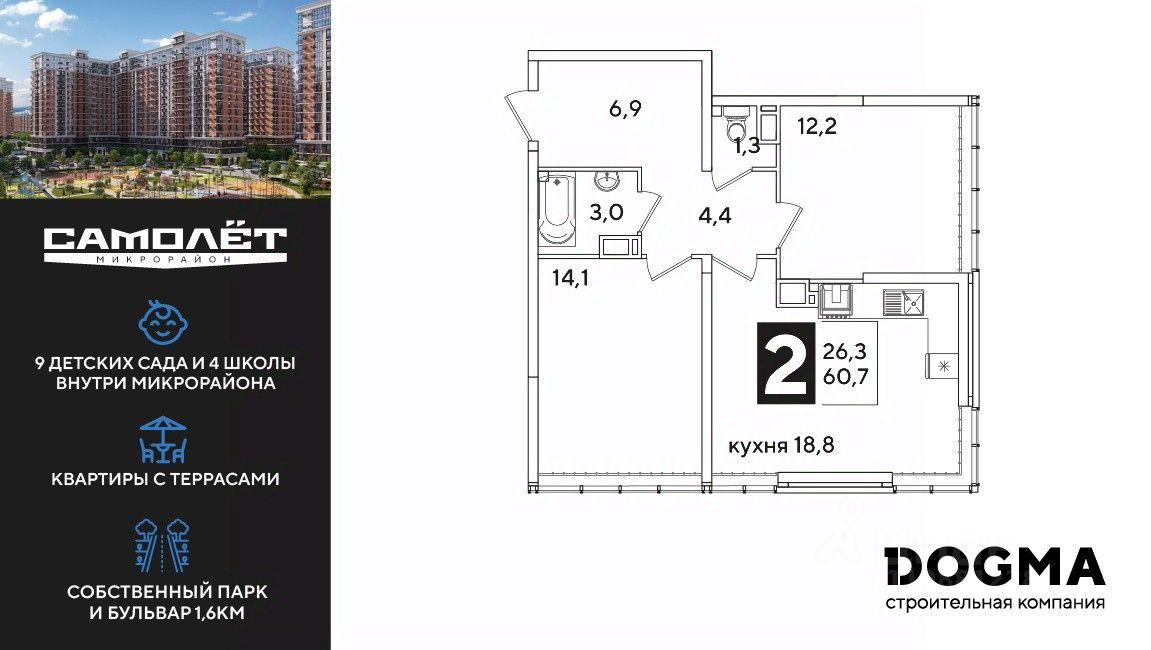 DOGMA - ТОП-3 застройщик по объему строительства в РФ. "САМОЛЁТ" — концептуальный жилой микрорайон, который расположен на северо-западе Краснодара, в районе Западного Обхода. Квартал спроектирован как "город в городе", поэтому здесь будет всё для комфортной жизни: современные дома с разными планировками, дороги, школы и детские сады, поликлиника, торговые центры, парки и аллеи. Микрорайон находится далеко от промышленных предприятий, сочетает удобство городской жизни и экологически благоприятную среду. Инфраструктура нового микрорайона: • 4 школы и 9 детских садов на территории микрорайона • Функциональные планировки • Собственный бульвар протяжённостью 1,6км • Светомузыкальный фонтан протяжённостью 55 метров • Амфитеатр • Парк 7 ГА • Скейт-парк • Детская аква-площадка • Круглосуточное видеонаблюдение и пост охраны Приобрести квартиру можно одним из способов: ипотека, рассрочка, наличный расчет.