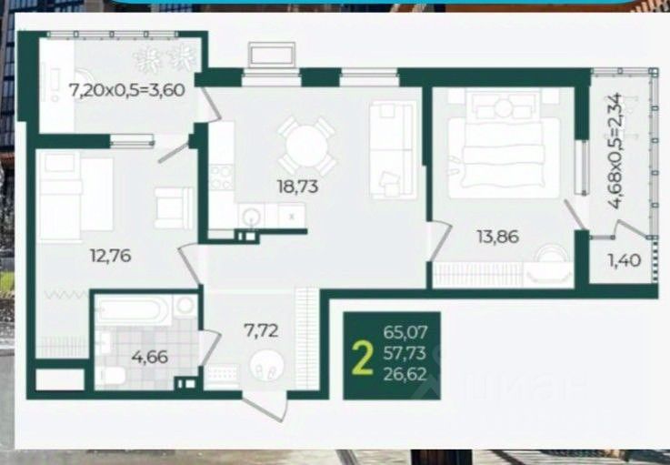 Две просторные лоджии 7,20м2 и 4,68м2 станут отличным местом для отдыха, создания зимнего сада или уютного уголка для работы. Они прекрасно освещены и остеклены
