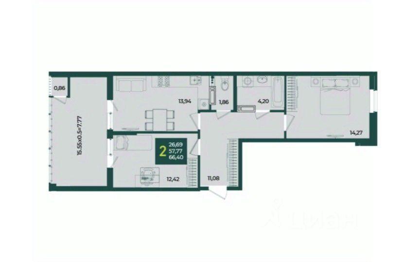 В продаже стильная 2 комнатная квартира с большой кухней 13,94 м2 с выходом на ленточную лоджию 15,55м2, прихожая 13,08 м2 с зоной для гардероба.