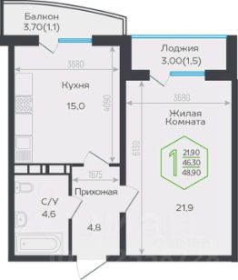 Продаётся 1-комнатная квартира в сданном доме, общей площадью 48.9 кв.м., на 3 этаже.