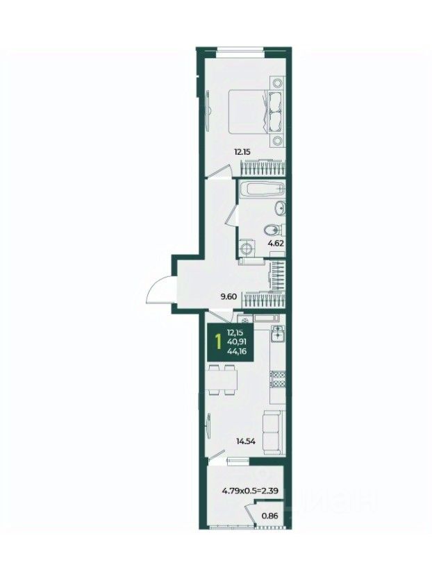 Просторная лоджия 4.79 м2 станет отличным местом для отдыха, создания зимнего сада или уютного уголка для работы. Она прекрасно освещена и остеклена