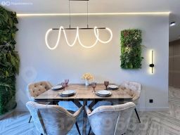 Сантехническое оборудование полностью заменено в соответствии с проектом. Лоджия переоборудована в отапливаемое помещение, предназначенное для будущего кабинета. В ванной комнате, прихожей и кухне установлены теплые полы. Предусмотрены интеллектуальные датчики. Сделаны парящие подвесные потолки с подсветкой. На кухне обустроена полноценная зона отдыха в европейском стиле. Установлен напольный конвектор, устраняющий холод, благодаря чему у витража комфортно даже зимой. Мебель, изготовленная на заказ, выполнена из качественных материалов и комплектующих. Кухонная техника представлена брендами Haier и Bosch. В каждой комнате установлены инверторные сплит-системы.