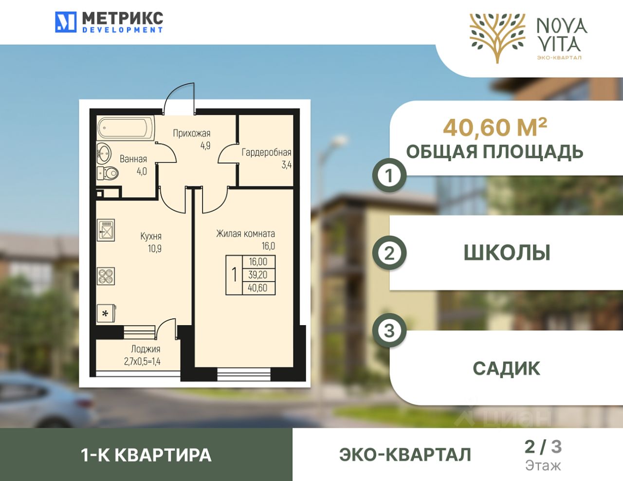 Продаётся 1-комнатная квартира в строящемся доме (Литер 22), срок сдачи: IV-кв. 2025, общей площадью 41 кв.м., на 2 этаже. Новый жилой комплекс "Nova Vita" от застройщика МЕТРИКС DEVELOPMENT расположен по адресу Краснодар, посёлок Берёзовый, улица имени А.Н. Лодыгина.