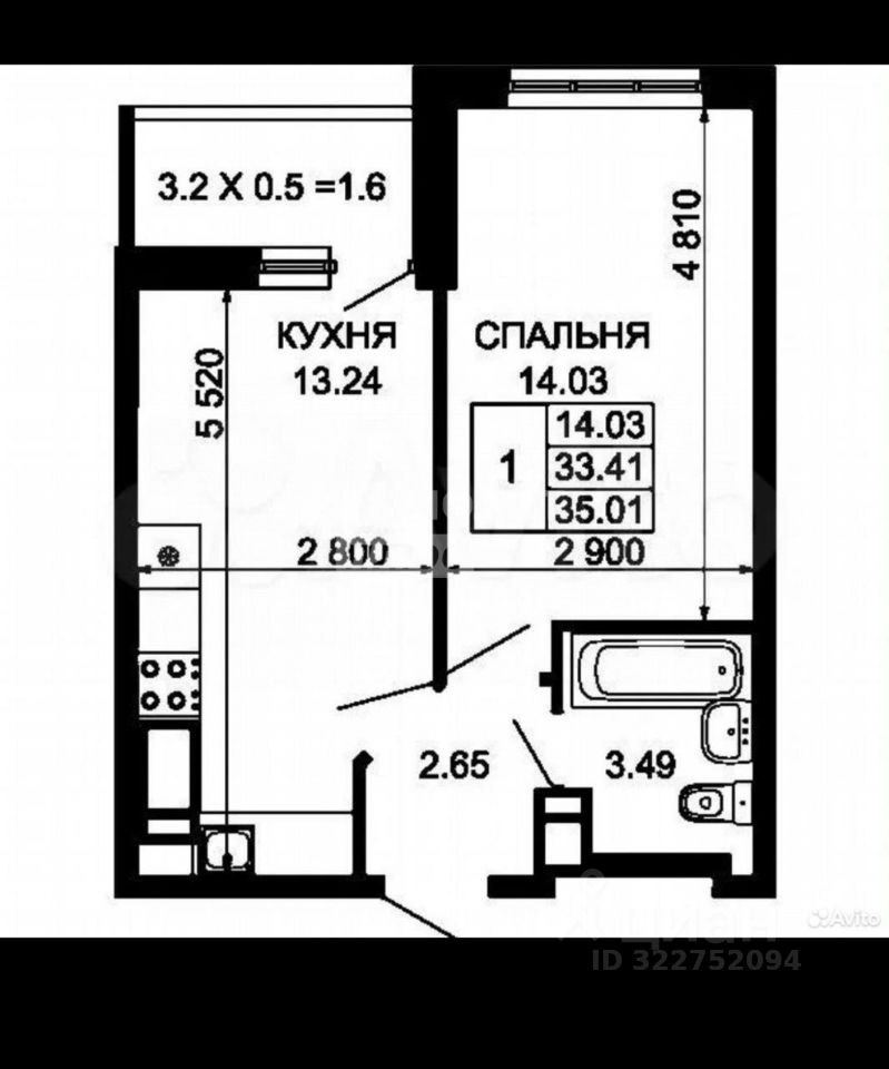 15 этаж: прихожая, санузел 3,49 м2., комната 14,03 м2., кухня 13,24 м2, лоджия 3,2 м2