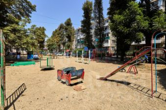 Квартира находится в большом тенистом дворе с оборудованной детской площадкой. Прямо перед окнами палисадник и пышный куст вьющихся роз. Окна выходят на две стороны дома. Удобная планировка: две изолированные спальни (13,2 кв м и 10,6 кв м) и большая проходная комната - гостиная 18,8 кв м. Ее тоже можно изолировать, установив перегородку.