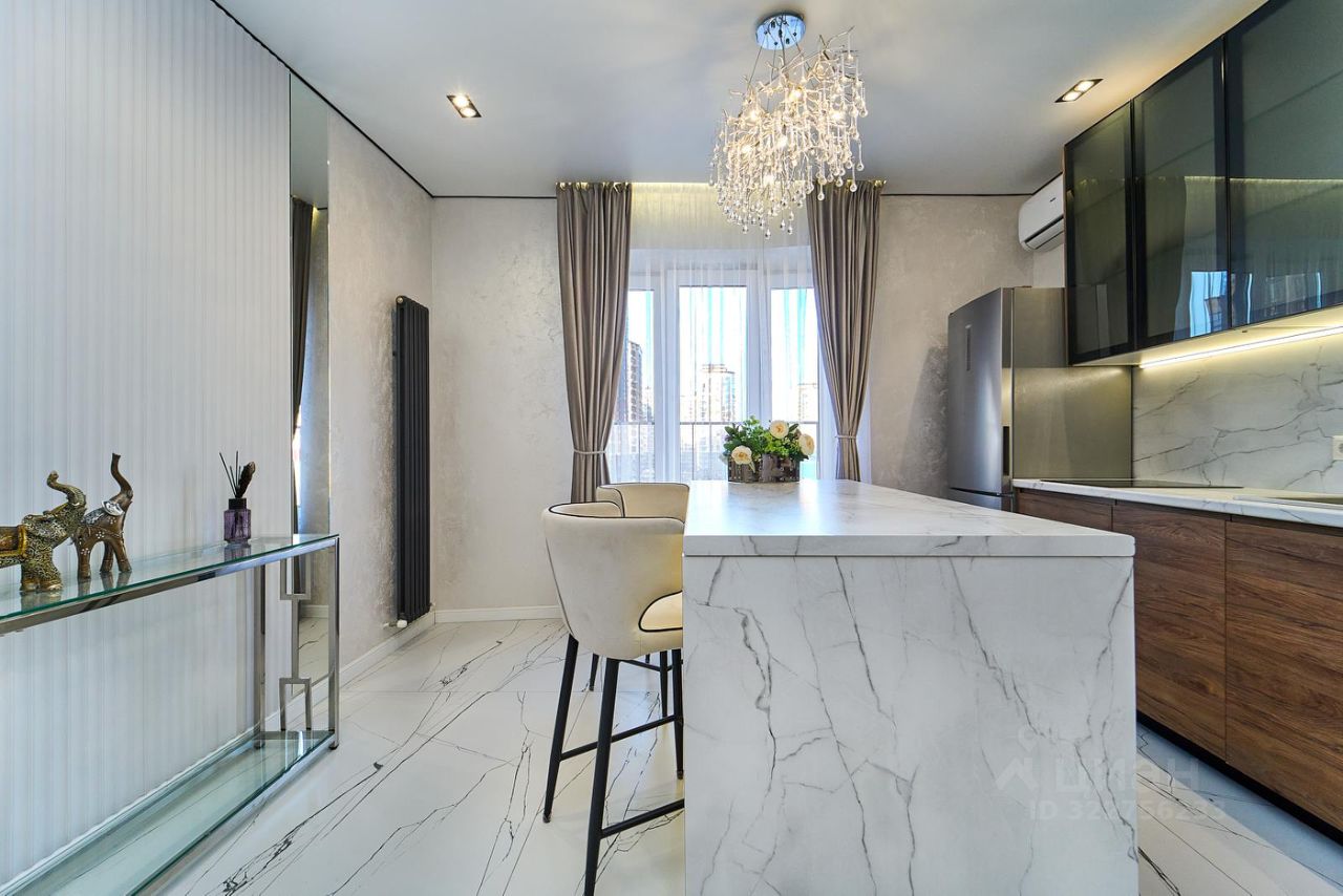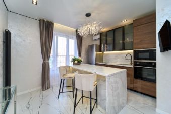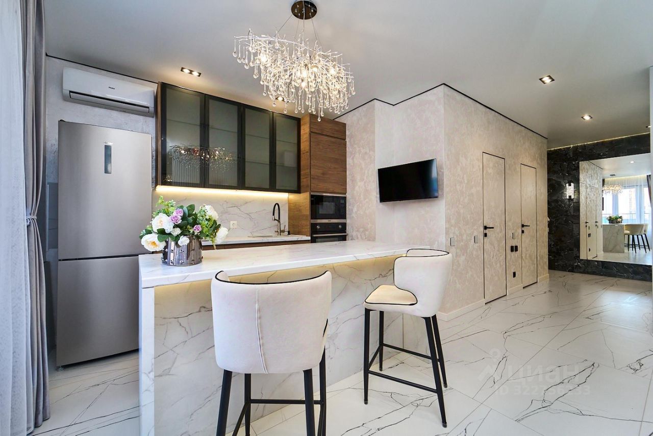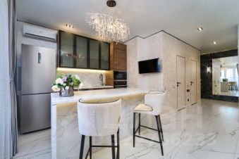 Кухня-гостиная оборудована современным кухонным гарнитуром и встроенной техникой, а оригинальная зона для приема пищи создаёт теплую и уютную атмосферу.