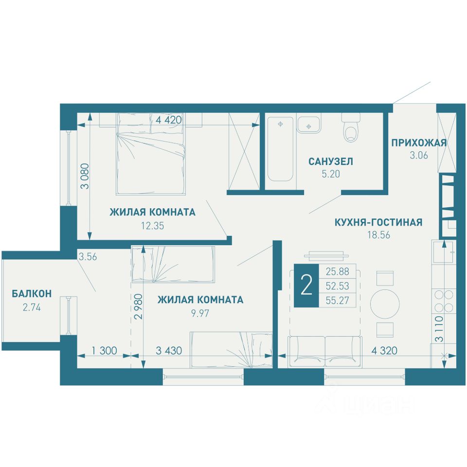 Общая площадь55,27 м²