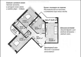 Планировка на три стороны, комнаты изолированные 22,0 кв.м., 17,17 и 16,22 кв.м с витражным остеклением. Состояние квартиры - черновая отделка. Заменена проводка, отремонтированы окна.