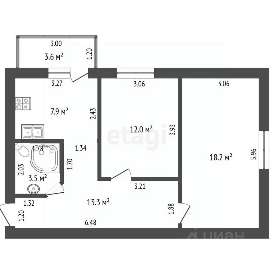 В квартире 2 изолированные комнаты: 18,2 кв.м и 12 кв.м., кухня 8 кв. м. с выходом на застеклённый балкон, санузел совмещённый.