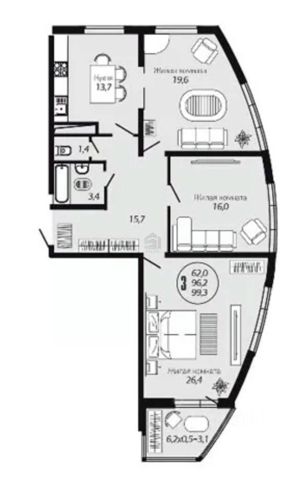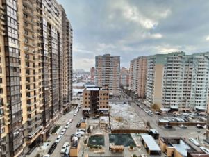 Общая площадь 98 кв м, 62 кв м комнаты, 14 кв м кухня. лоджия застеклена. 16 этаж .