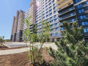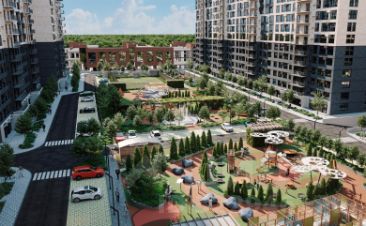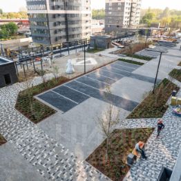 Двор жилого комплекса представляет собой закрытую территорию с аллеями, зонами воркаута, площадками для медитации и активного спорта. Здесь также предусмотрены детские площадки и места для отдыха, что идеально подходит для работы на удаленке.