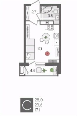 В продаже студия от застройщика! ЖК "Рекорд", г. Краснодар, Литер 1, общей площадью 28 кв.м., на 17 этаже.