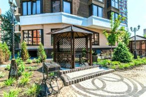 Ландшафтное озеленение, зона барбекю, детские и спортивные площадки, фонтаны с уютной зоной отдыха.