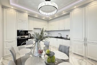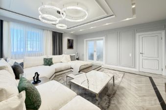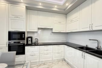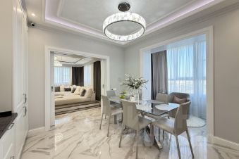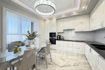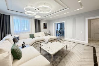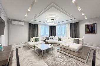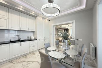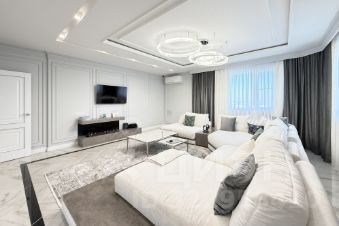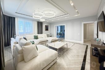 Площадь 145,2 м², потолки 3 м, дизайнерский ремонт из премиальных материалов. Просторная гостиная, отдельная кухня, хозяйская спальня со своей большой гардеробной, детская комната, два санузла — с ванной и душевой. Много мест для хранения, планировка продумана до мелочей.