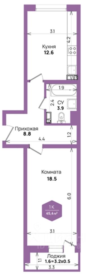Общая площадь квартиры — 43,5 кв. м, жилая площадь — 18,3 кв. м. Просторная кухня в 10,8 кв. м станет отличным местом для дружеских посиделок или семейных ужинов.