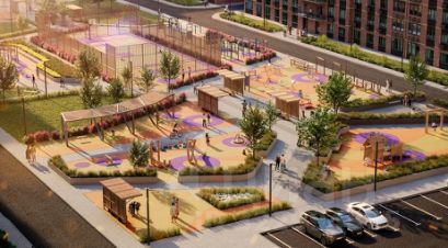 В центре двора будет большая спортивная зона с тренажерами, а дополнит тему спорта универсальное спортивное поле.