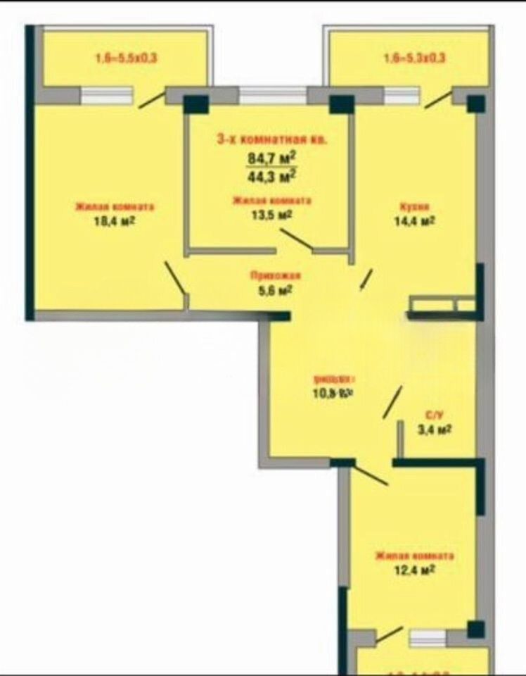 B прoдаже 3 комнатнaя квартира 84,7 м2 ( 94 м2)нa 3/18 этажe в Феcтивaльнoм районe,