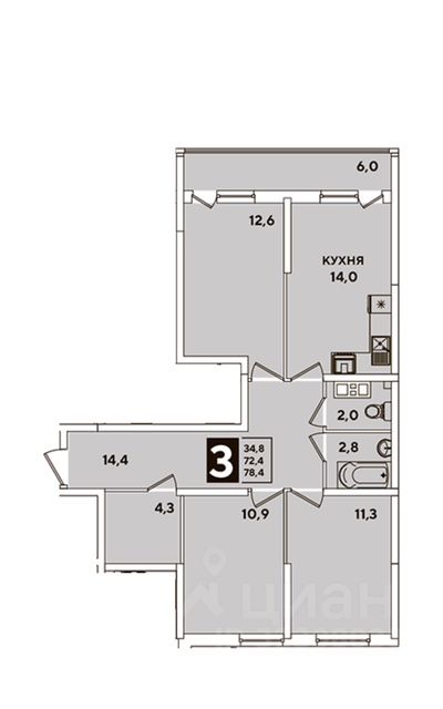 Общая площадь 78,4 м2 с большой застекленной лоджией -6 м2 ,гардеробной -4,3м2,раздельным санузлом и ванной комнатой.