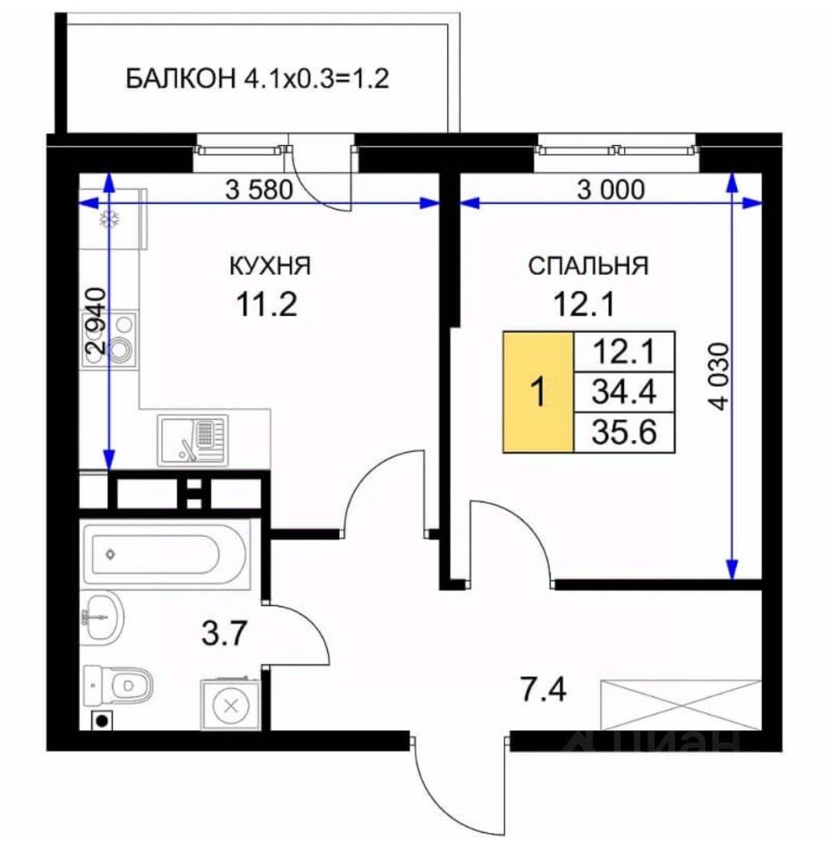 Арт. 111713500 Продается квартира 35.2 м2 в предчистовой отделке.