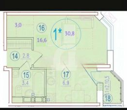 Общая площадь 30,8 кв.м, просторная комната 16,6 кв.м и кухня 6,9 кв,м, широкая прихожая , совмещенный санузел 3,4 кв.м, гардеробная комната - 3 кв.м, застекленная уютная утепленная лоджия для комфортного вечернего отдыха!