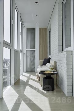 На шикарной ленточной лоджии обустроено место отдыха, витражное остекление.