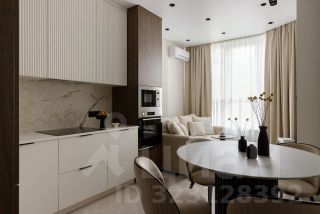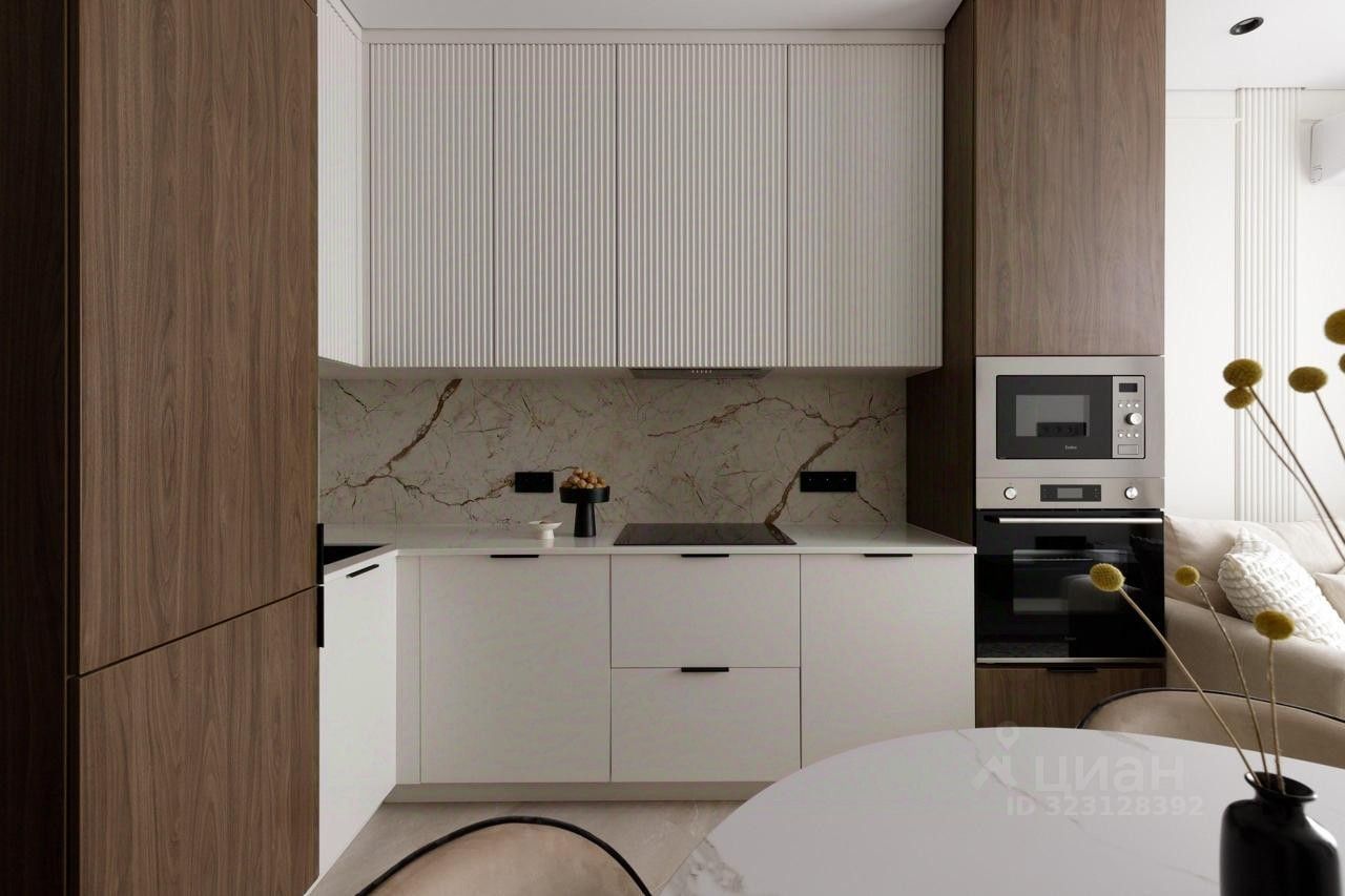 В квартире выполнен дизайнерский ремонт в классическом стиле. На кухне установлен кухонный гарнитур со встроенной техникой: посудомоечной машиной, варочной панелью, духовым шкафом, встроенной микроволновой печью и холодильником.