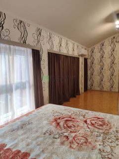Совмещённый санузел, в большой комнате отделили две комнаты под детские по 11 кв.м., кухня-гостиная 30 метров, отдельная спальная комната 22,8 кв. метров, просторный холл 12,4 кв.м. Потолки очень высокие (3,03 м) и даже в месте скосов (2,45 м) головой до них не достать. Ремонт от застройщика. Вся мебель и техника остается новым хозяевам. В спальнях оборудованы ниши под хранение вещей.