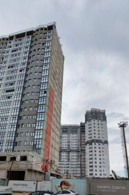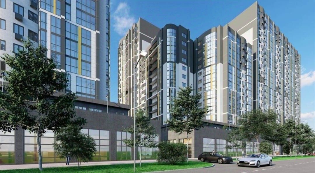 ЖК гармонично вписан в городскую среду.Фасады жилых секций, выполненные в элегантной дуэте светло-серо-голубого и темно-серого оттенков камешковой штукатурки, выглядят современно и респектабельно.