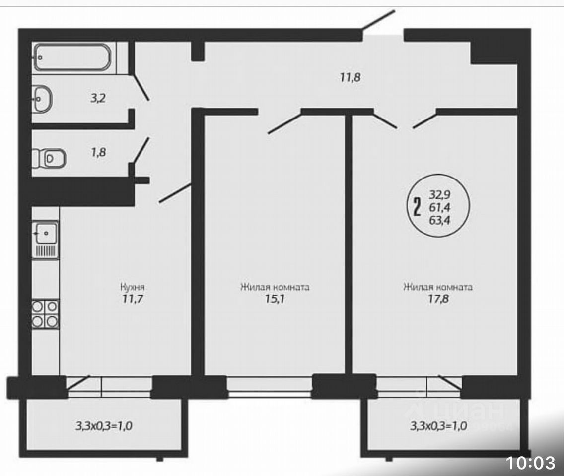 * площади балконов: 3,3 и 3,3 м² (один балкон выходит из кухни, второй из жилой большой комнаты).