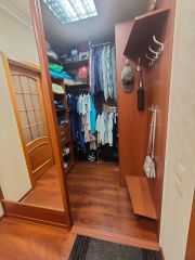 Вместительная гардеробная в коридоре с раздвижными большими зеркальными дверьми — удобное решение для хранения вещей, что особенно актуально для тех, кто ценит порядок и функциональность.