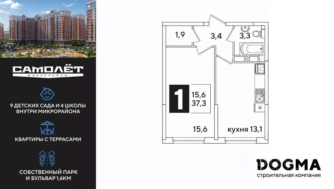 DOGMA - ТОП-3 застройщик по объему строительства в РФ. "САМОЛЁТ" — концептуальный жилой микрорайон, который расположен на северо-западе Краснодара, в районе Западного Обхода. Квартал спроектирован как "город в городе", поэтому здесь будет всё для комфортной жизни: современные дома с разными планировками, дороги, школы и детские сады, поликлиника, торговые центры, парки и аллеи. Микрорайон находится далеко от промышленных предприятий, сочетает удобство городской жизни и экологически благоприятную среду. Инфраструктура нового микрорайона: • 4 школы и 9 детских садов на территории микрорайона • Функциональные планировки • Собственный бульвар протяжённостью 1,6км • Светомузыкальный фонтан протяжённостью 55 метров • Амфитеатр • Парк 7 ГА • Скейт-парк • Детская аква-площадка • Круглосуточное видеонаблюдение и пост охраны Приобрести квартиру можно одним из способов: ипотека, рассрочка, наличный расчет.