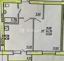 Общая площадь квартиры - 44,7 кв.м. Жилая - 19,8 кв.м. Площадь кухни - 14,6 кв.м. Санузел совмещенный. Просторный балкон.