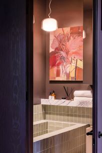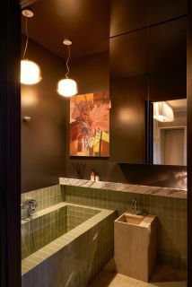Ванна выстроена с нуля и обрамлена плиткой, с системой подогрева. При этом все коммуникации, бытовые предметы и техника скрыты внутри фальшстены.