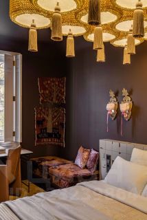 Акценты в спальне - авторская люстра и комод ручной работы, отреставрированный и обрамленный медным листом.