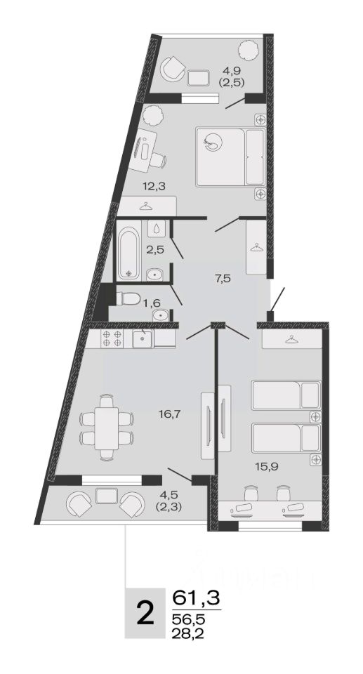 Общая площадь61,3 м²